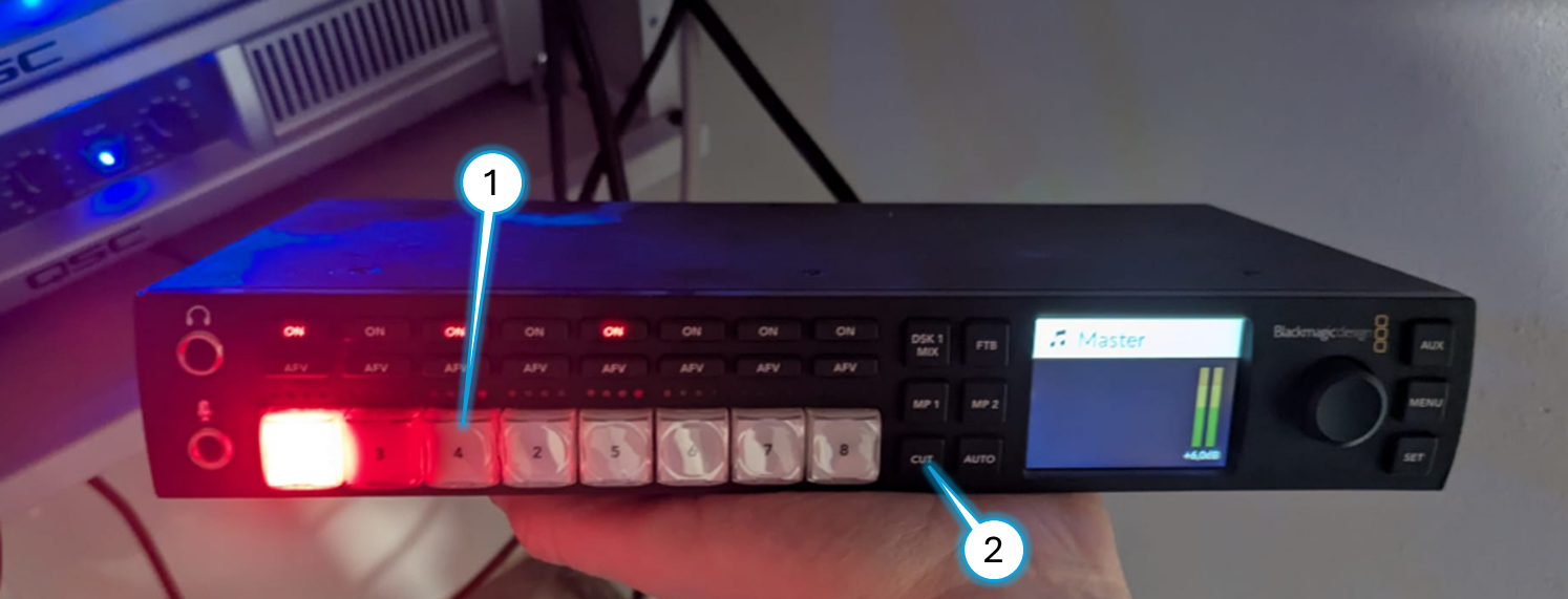 ➡️ drücke bei dem Bildmischer im Anschlussraum 1 auf ‘Qelle 4’(1) (Für den GrafikPc-Café) und anschließend auf ‘CUT’(2)