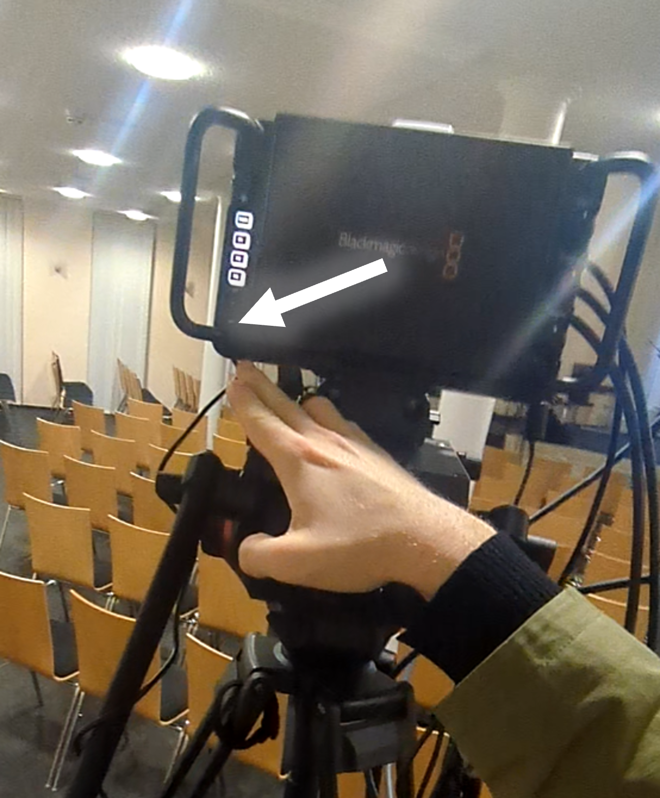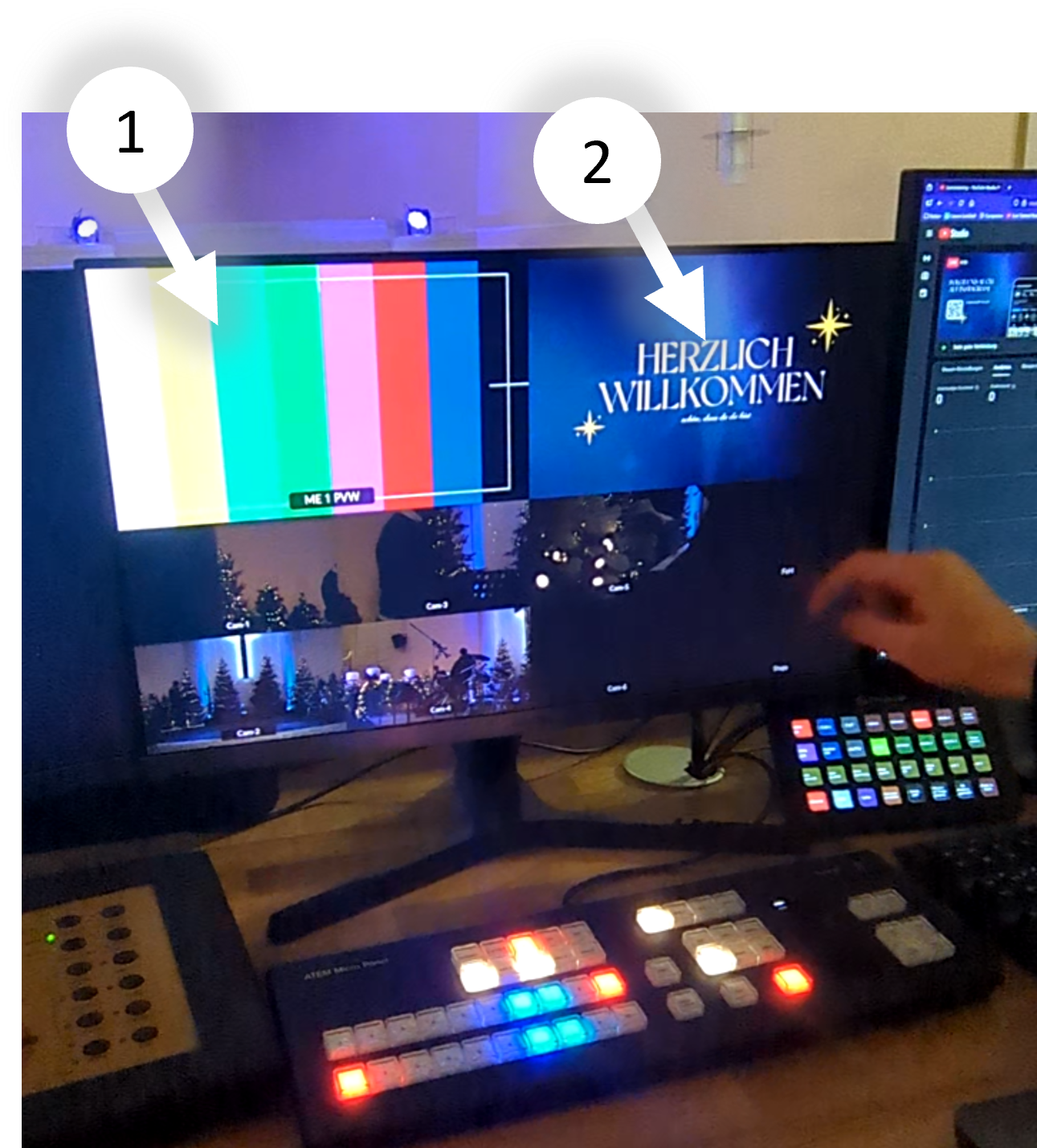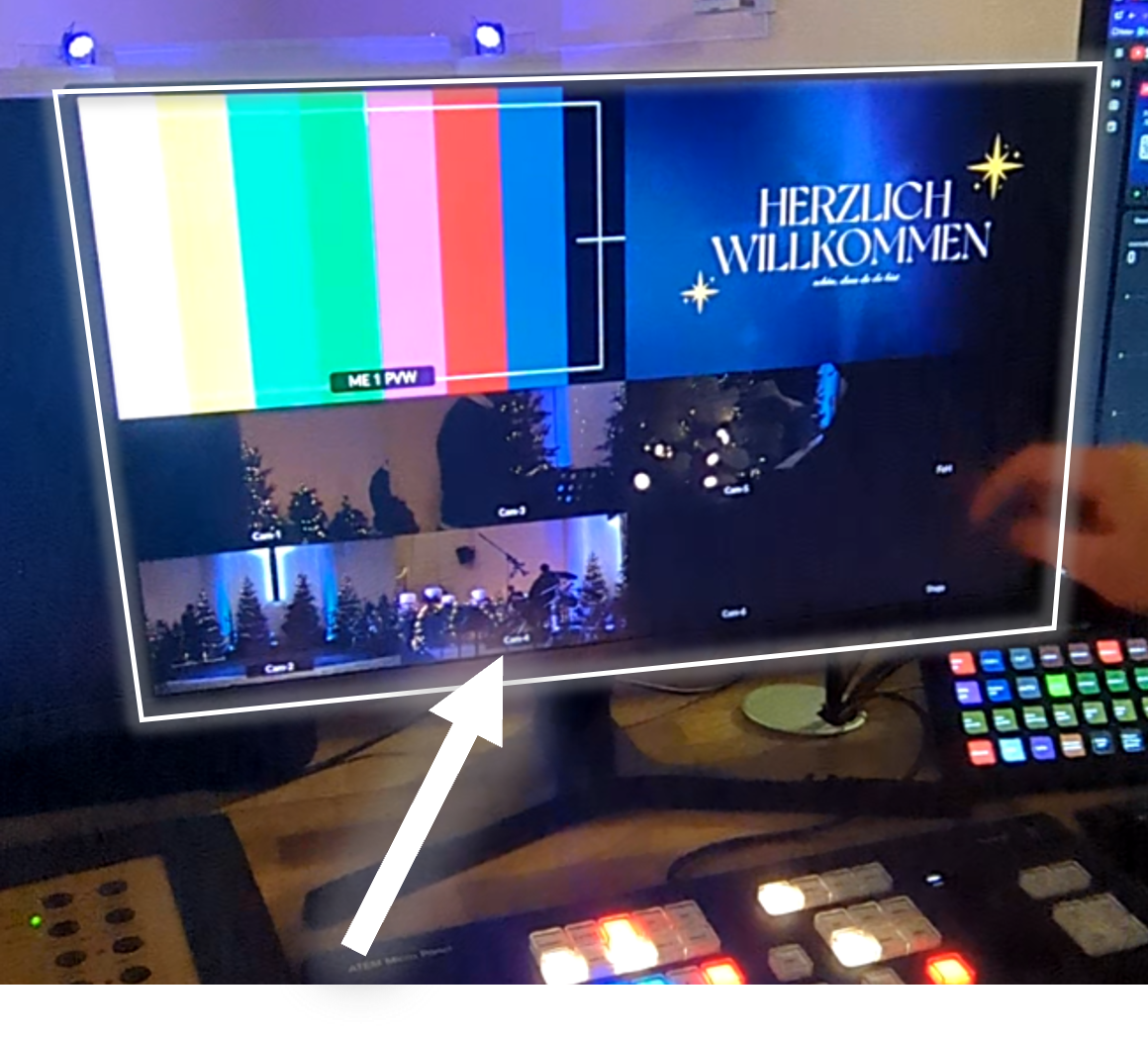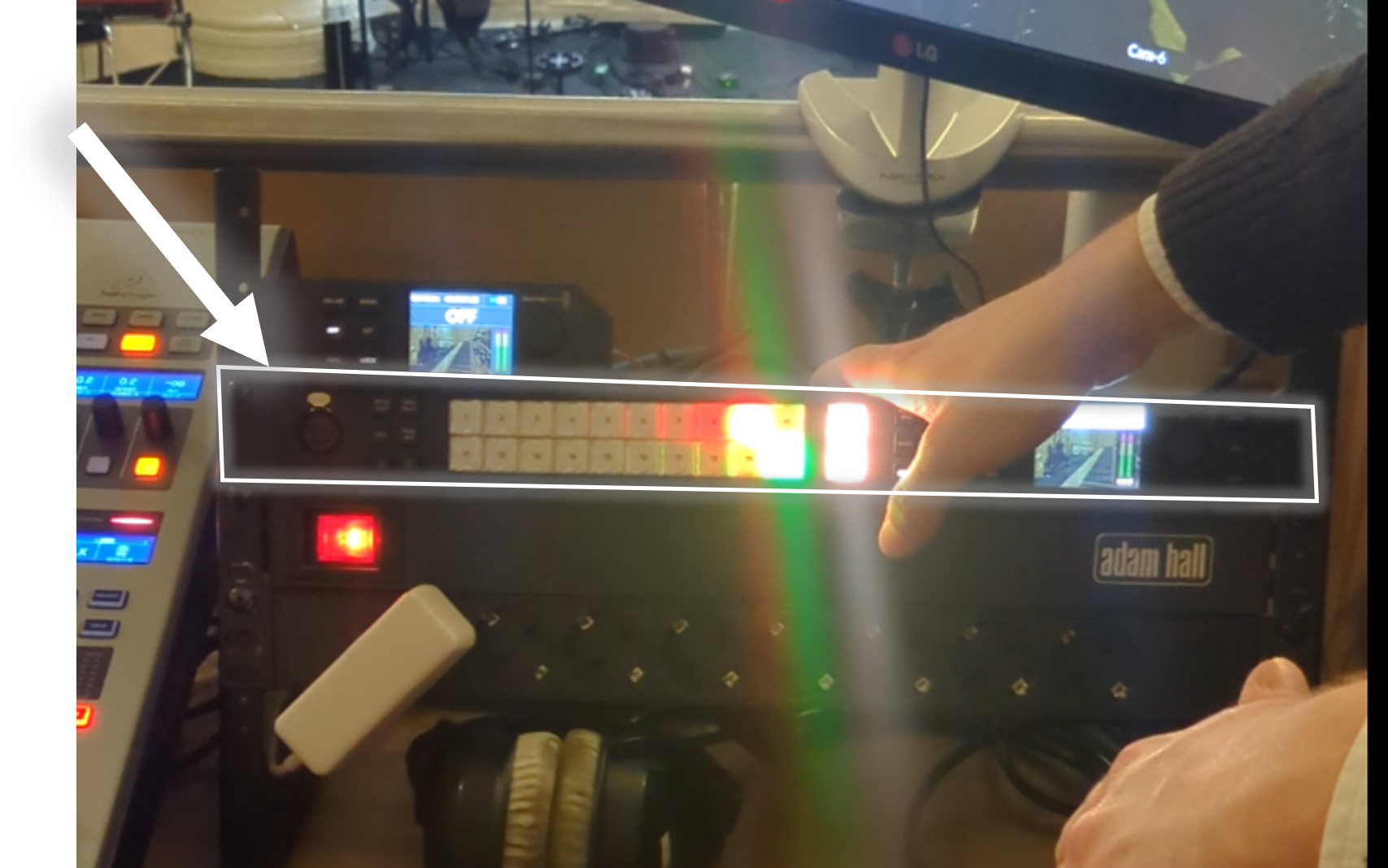 - Wenn der Bildmischer dadurch an geht, hört man ein ‘huuuiiii’ (der Lüfter vom Bildmischer) -> ✅ Dann sollte der Bildmischer rot leuchten und alles funktionieren