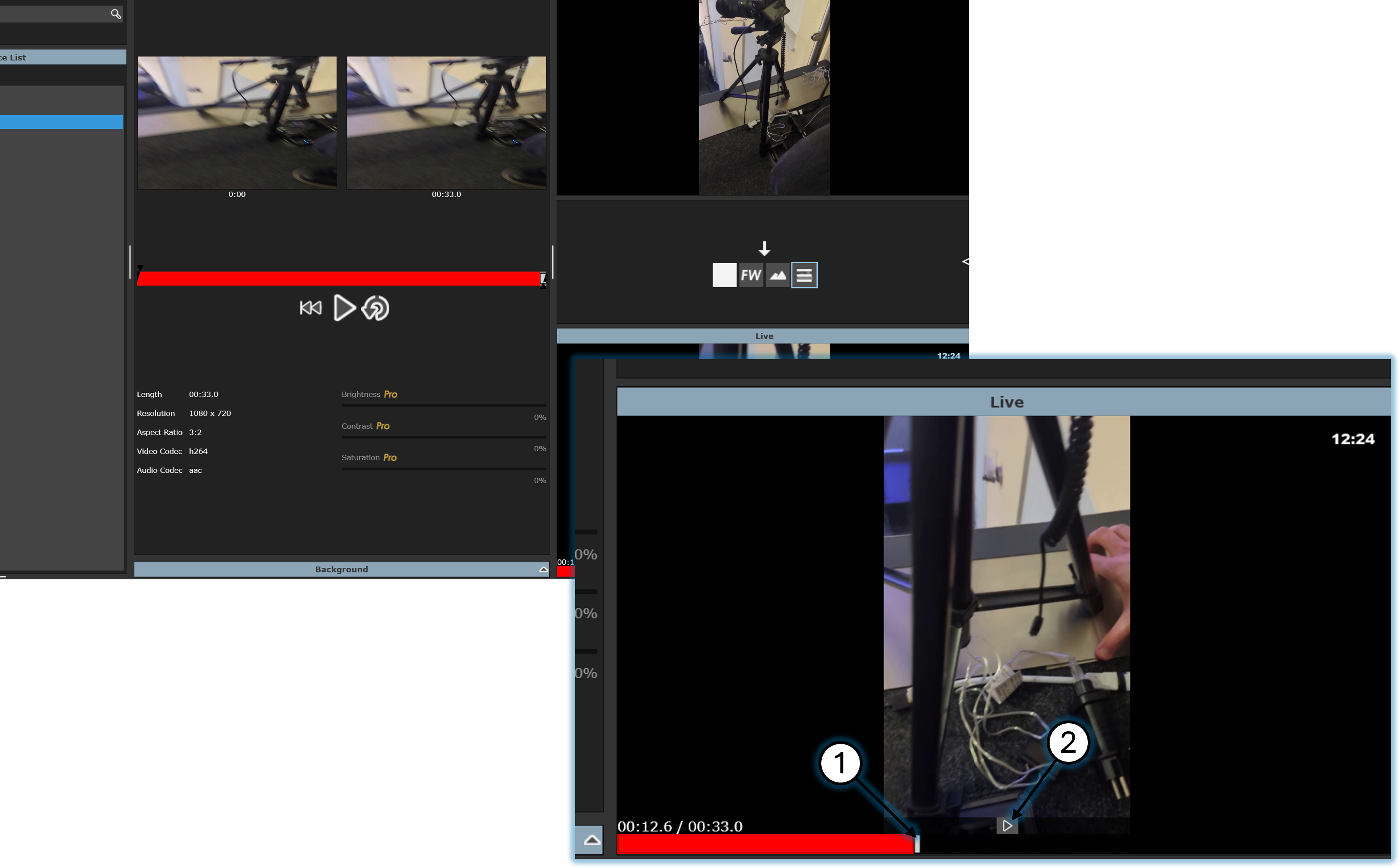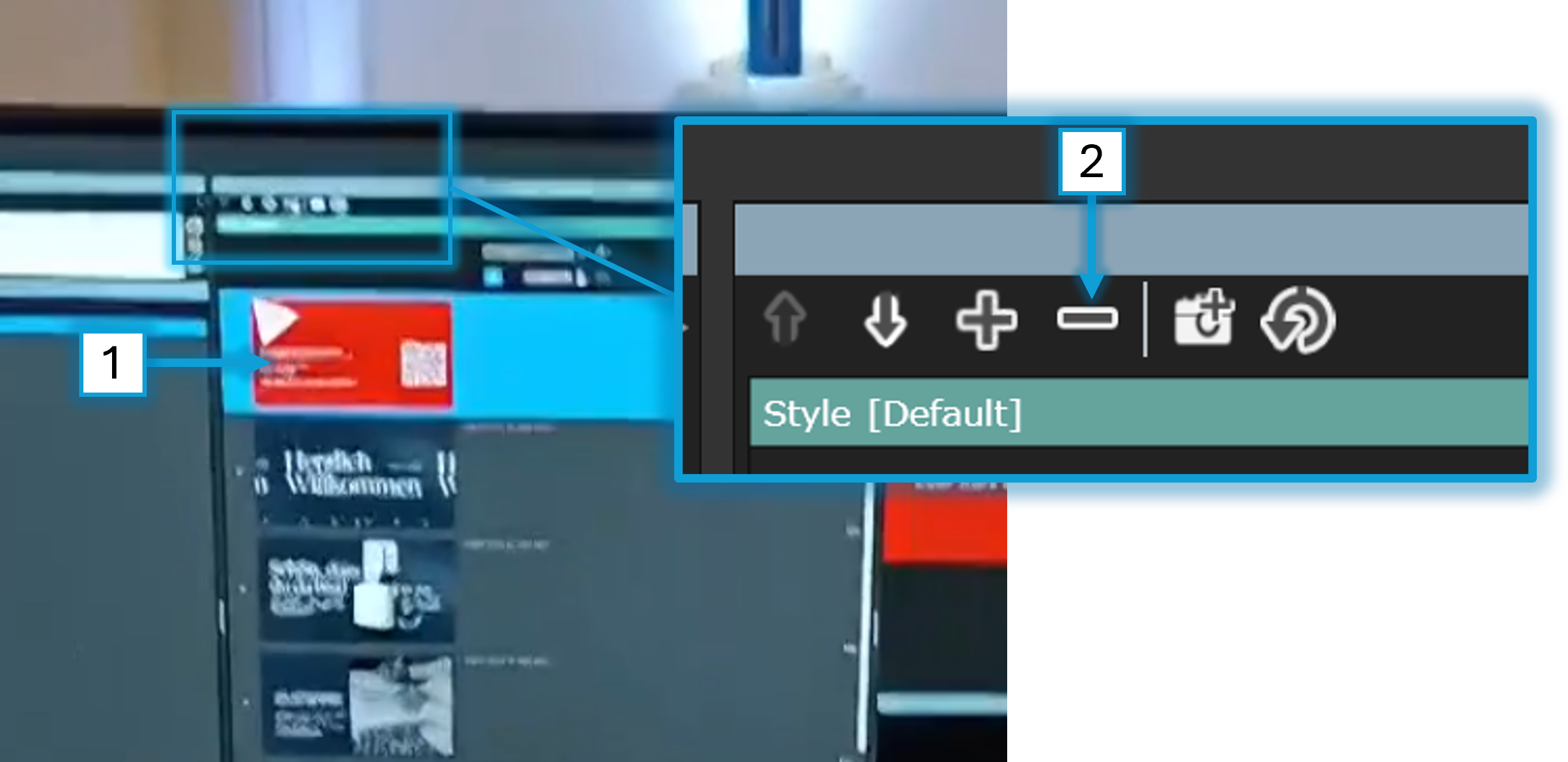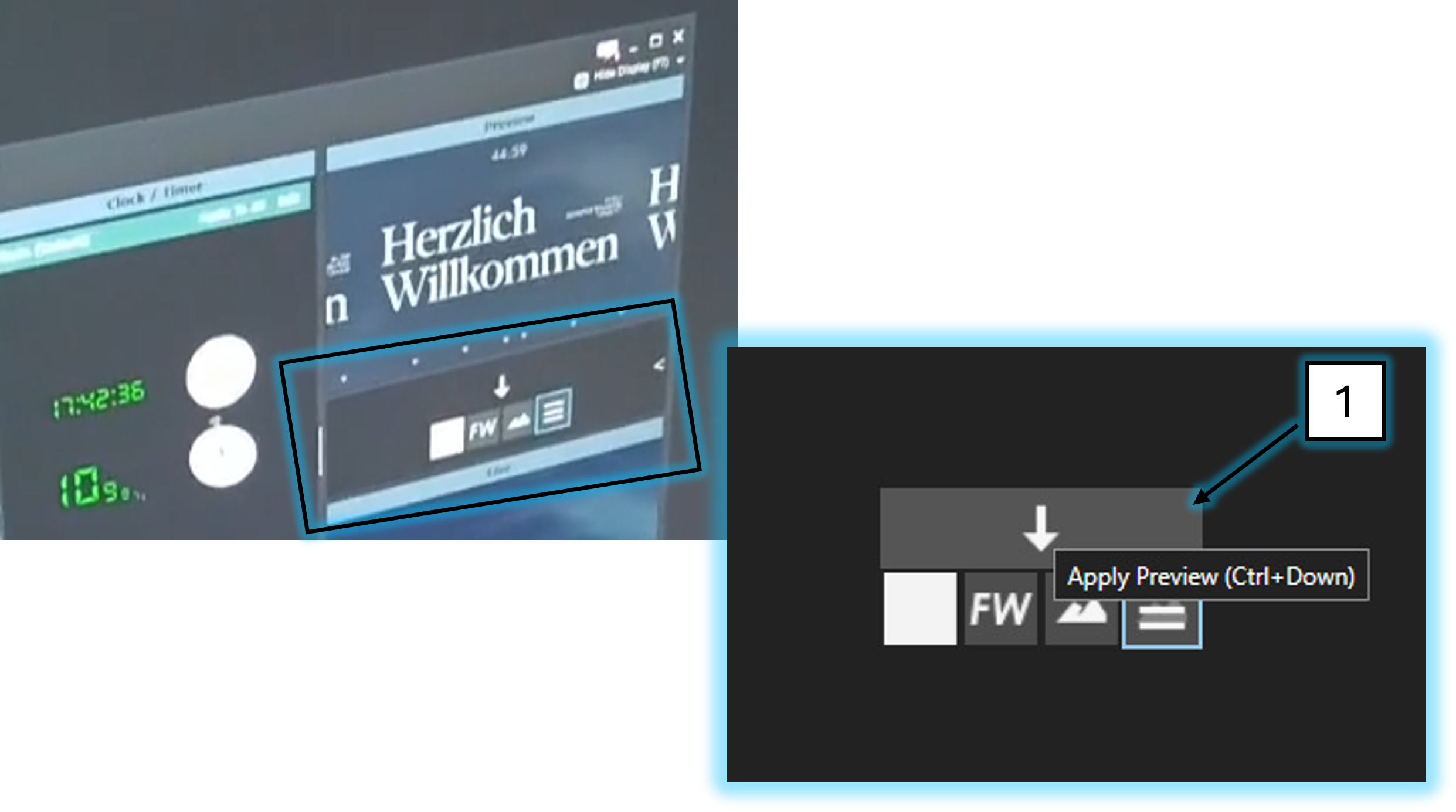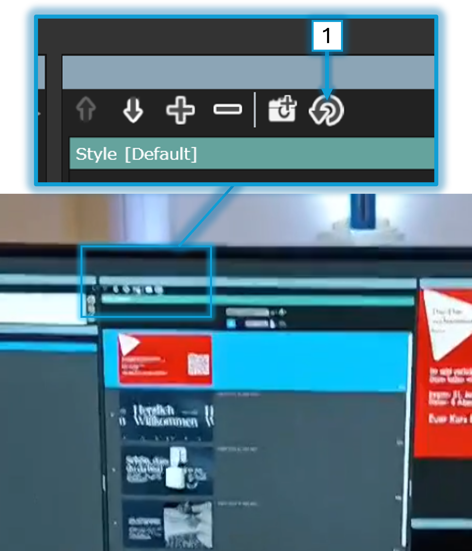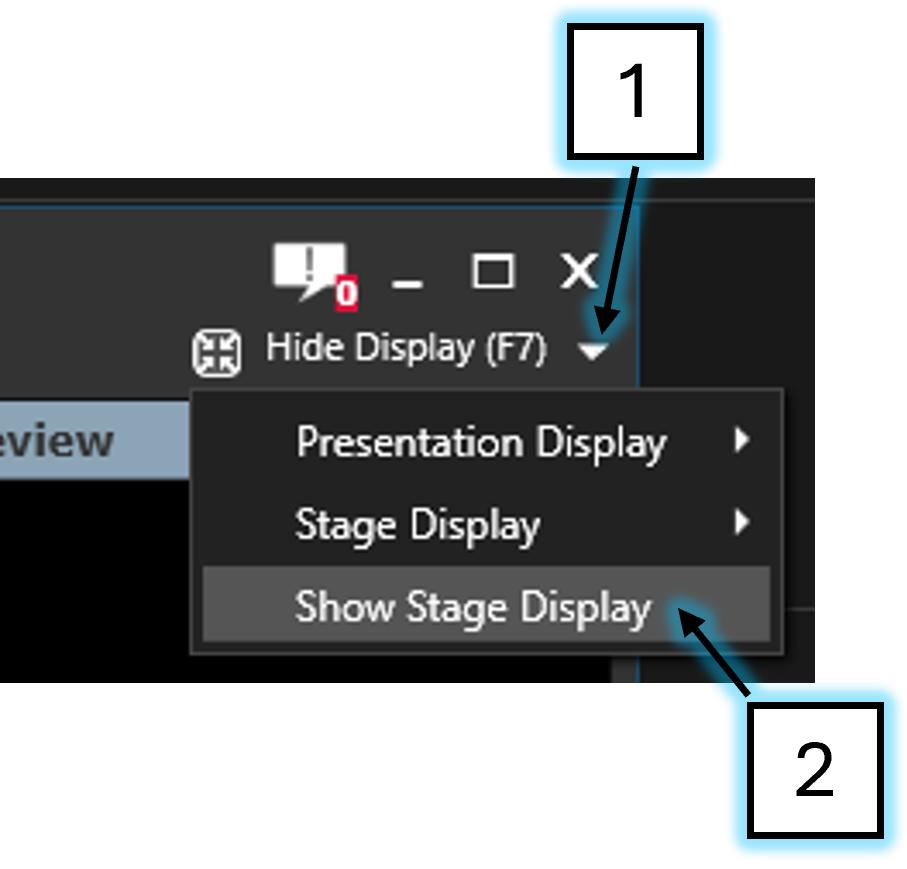 Klicke auf den Pfeil (1) oben rechts in der Ecke. Klicke auf ‘Show Stage Display’.