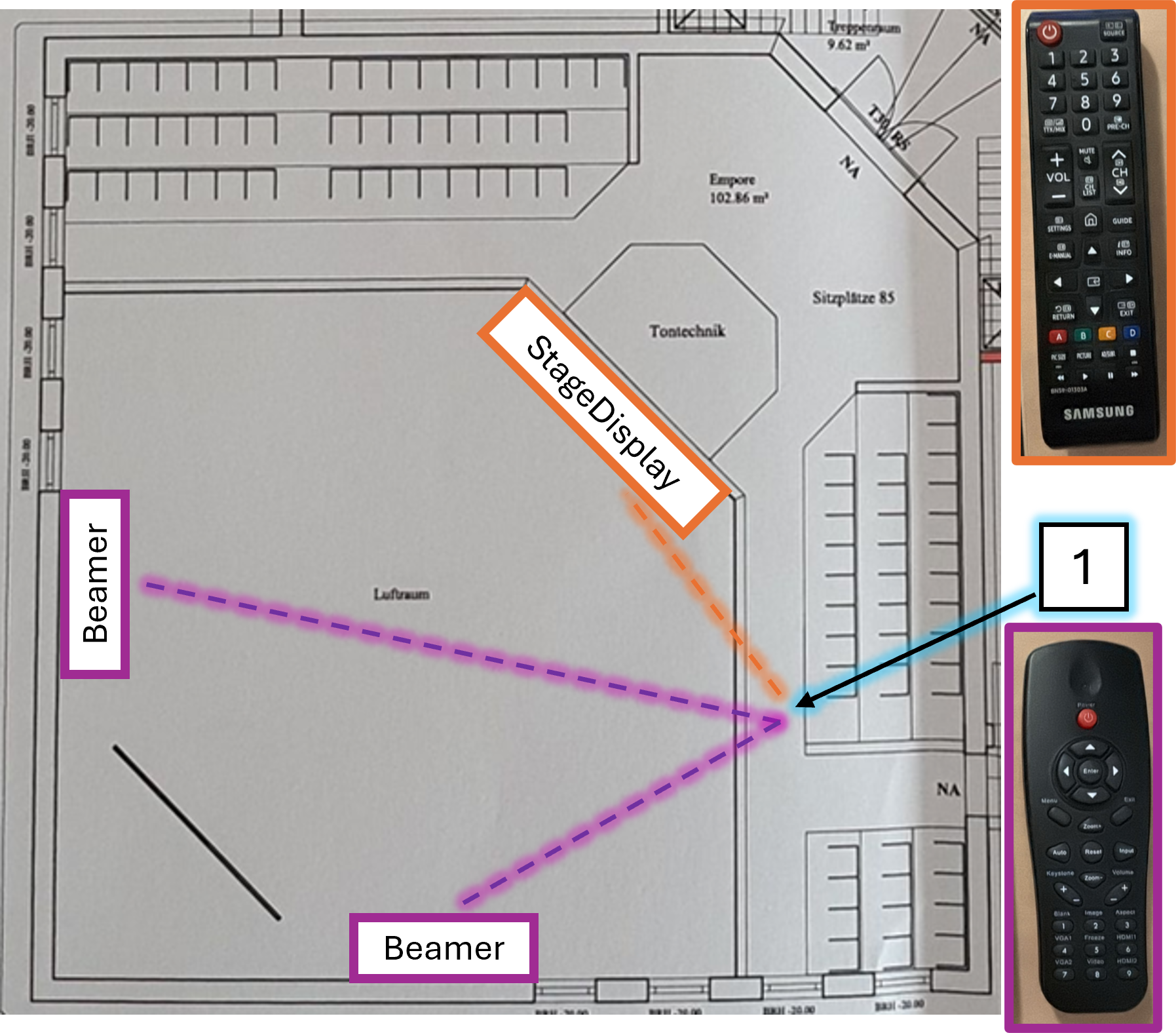 ✅ Beamer und Fernseher einschalten (Fernbedienungen liegen neben Monitor)