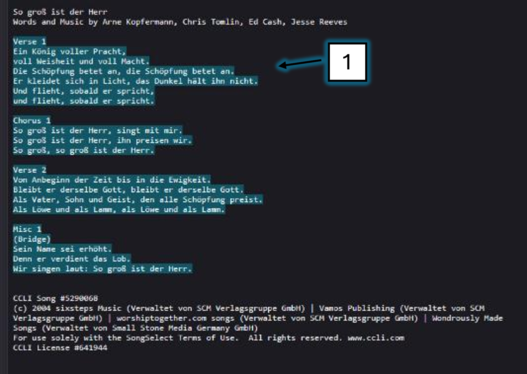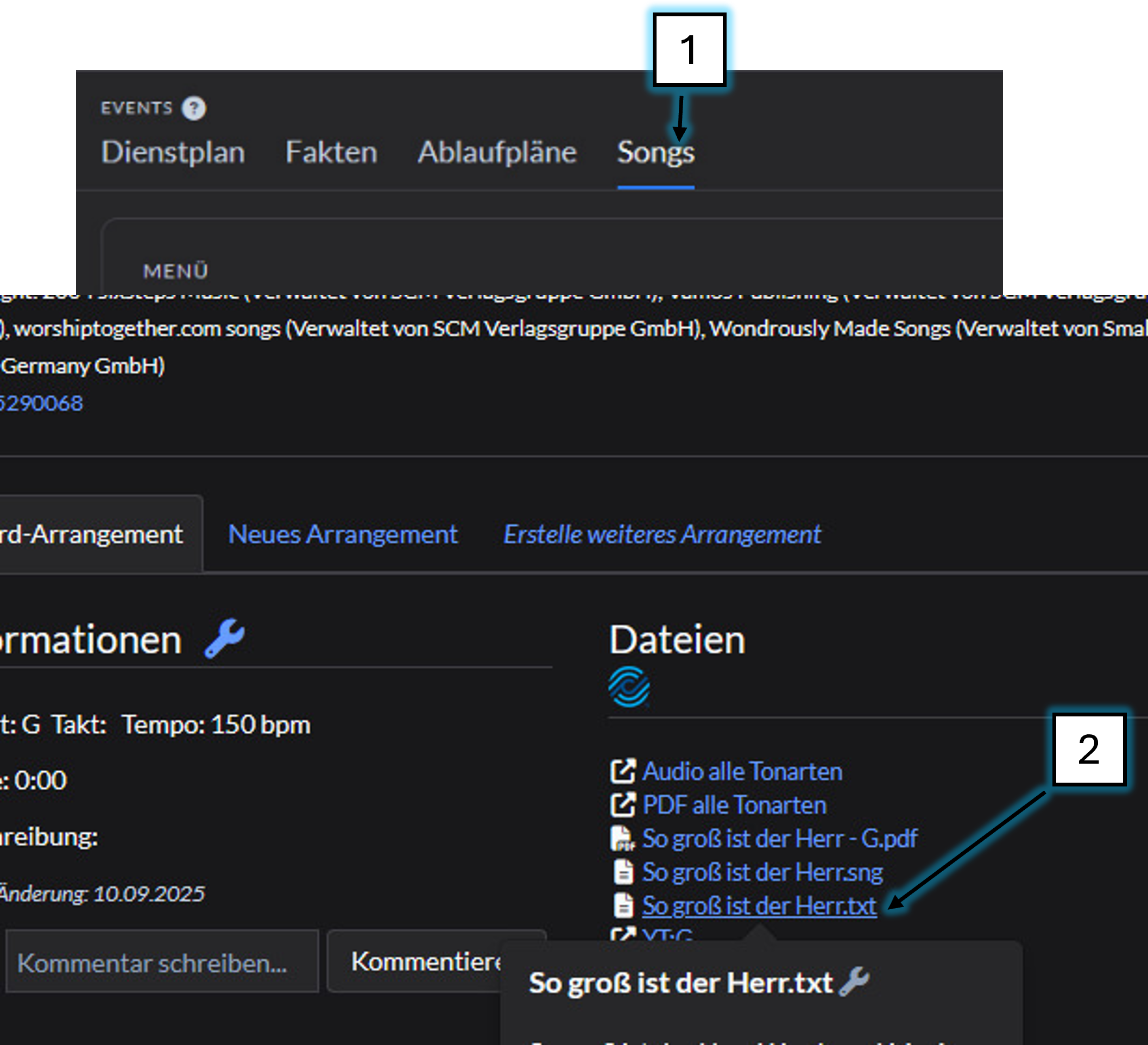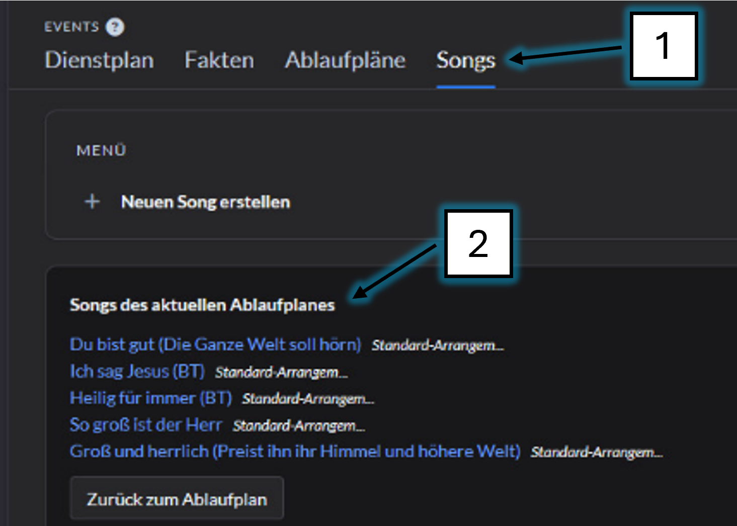 Öffne in ChurchTools den Songtext indem du auf den Reiter Songs (1) gehst und und dort die entsprechende ‘