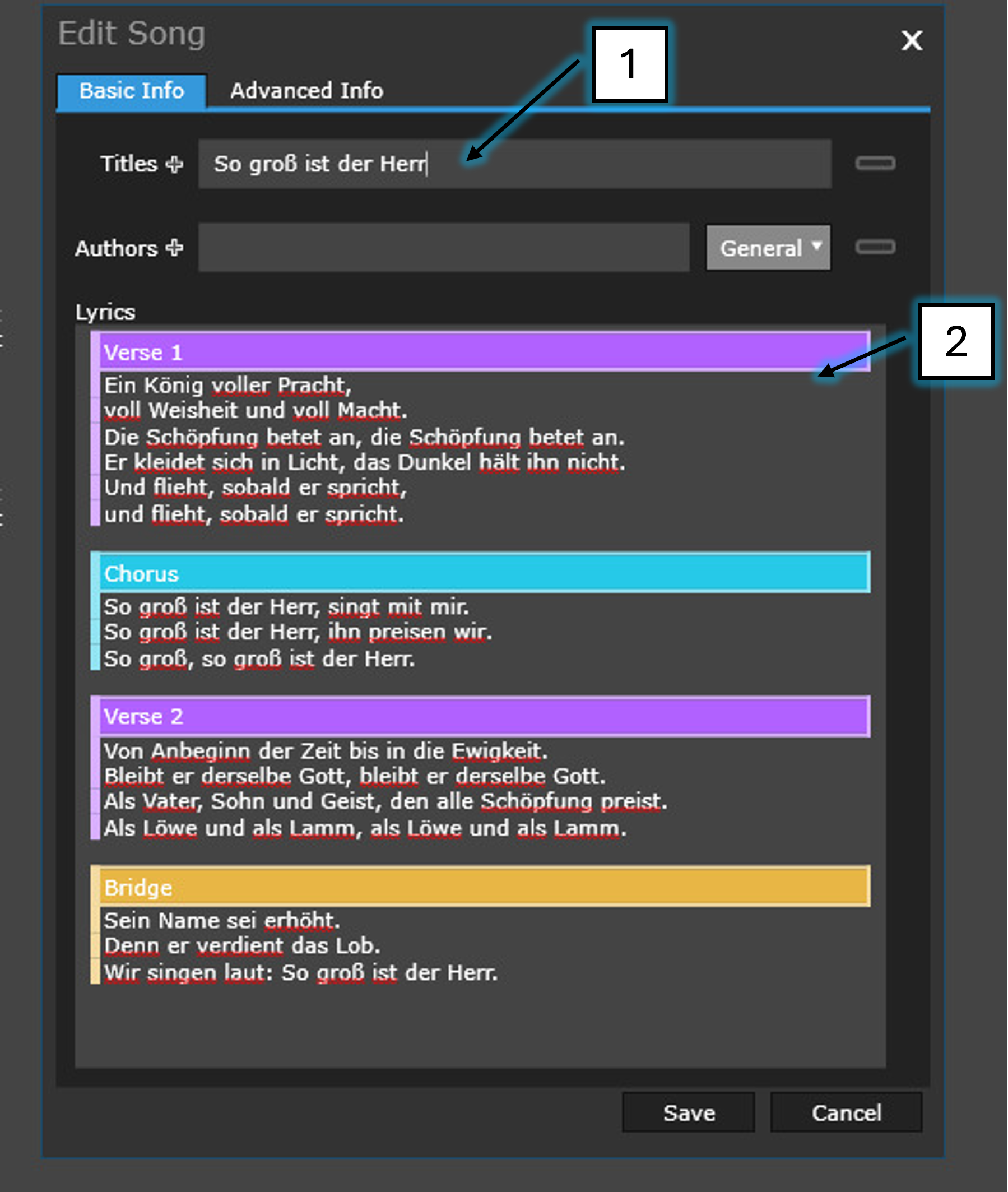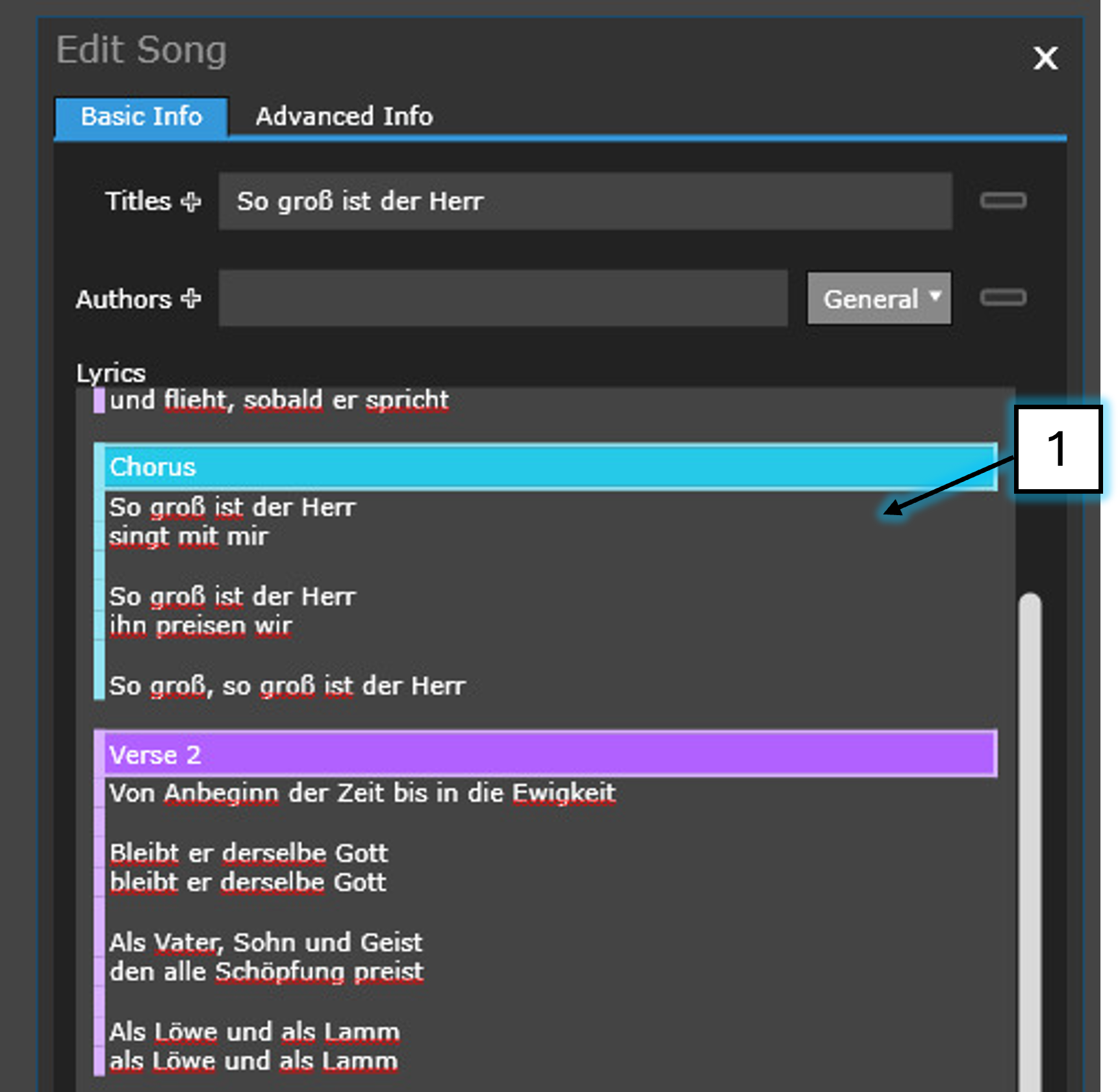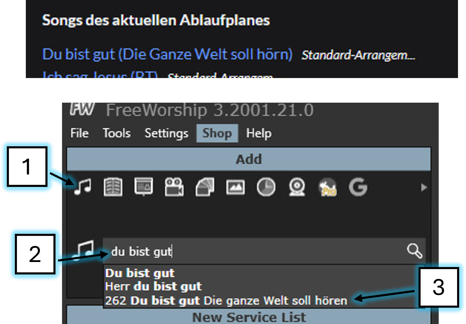 Öffne in ChurchTools den Songtext indem du auf den Reiter Songs (1) gehst und und dort die entsprechende ‘