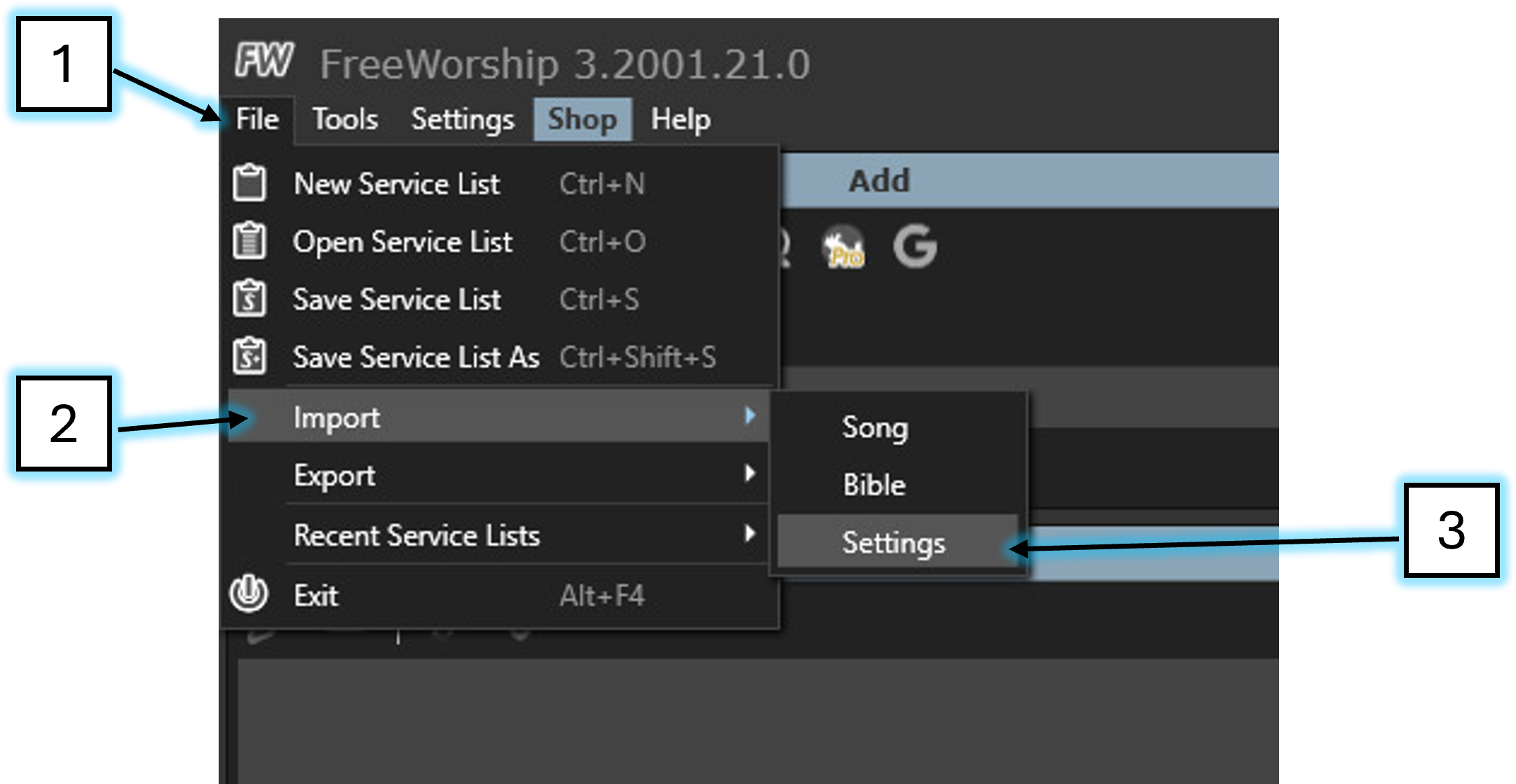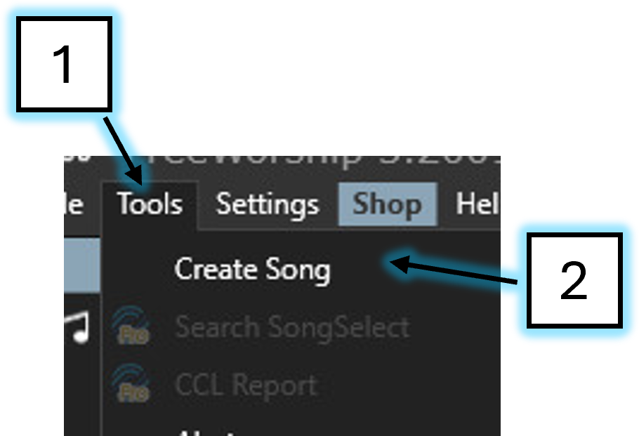 In FreeWorship klickst du auf ‘Tools’(1) > ‘Create Song’(2)