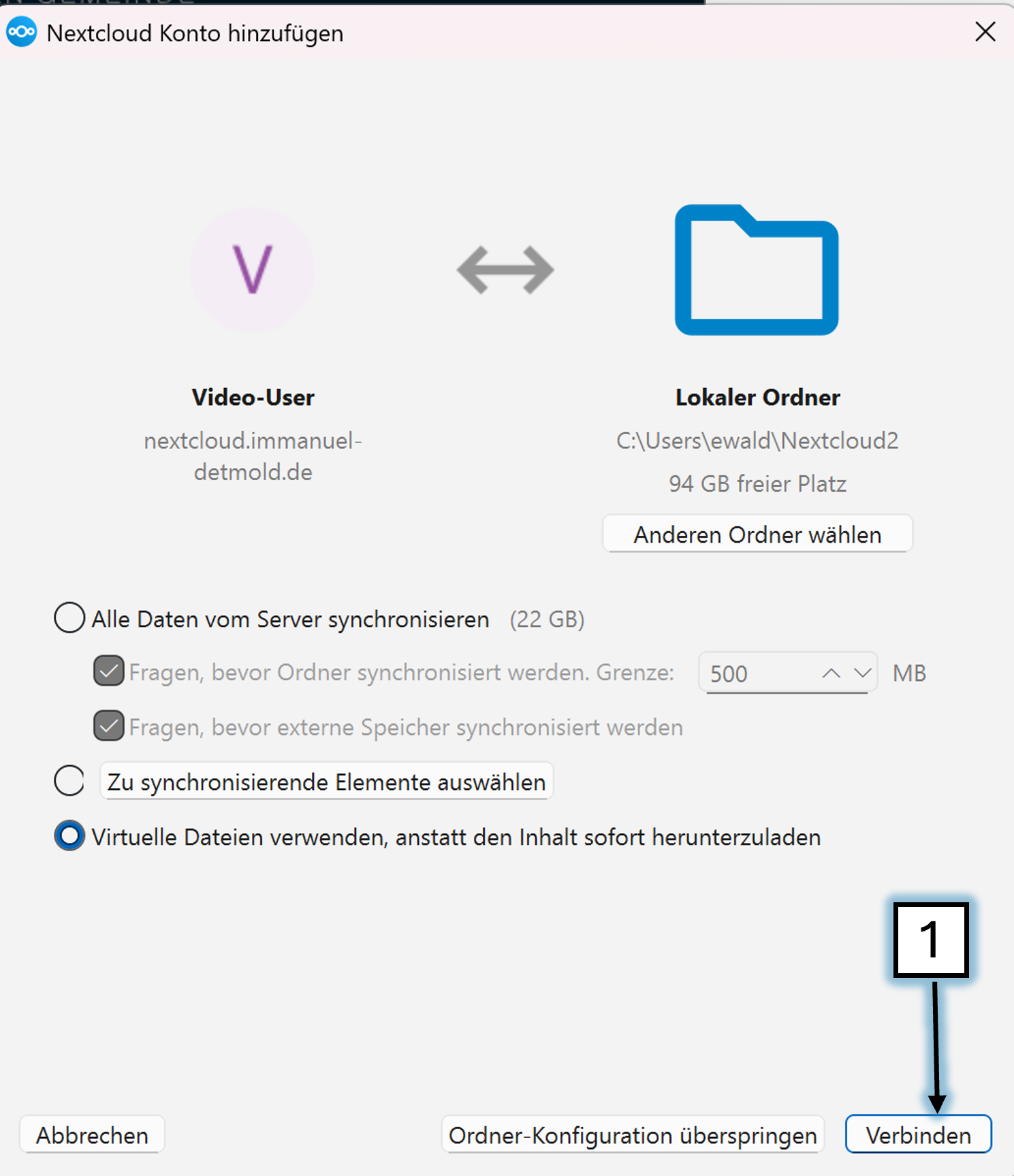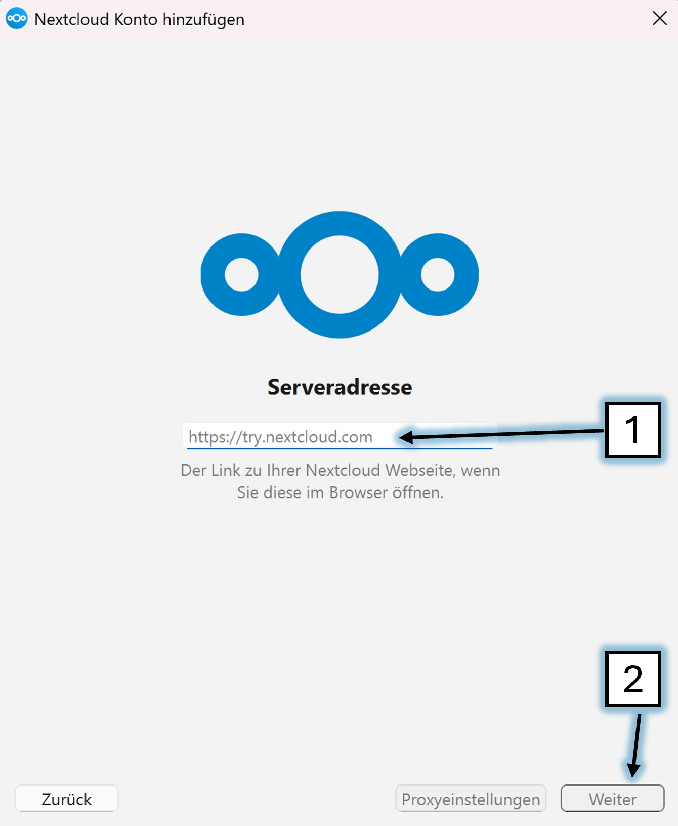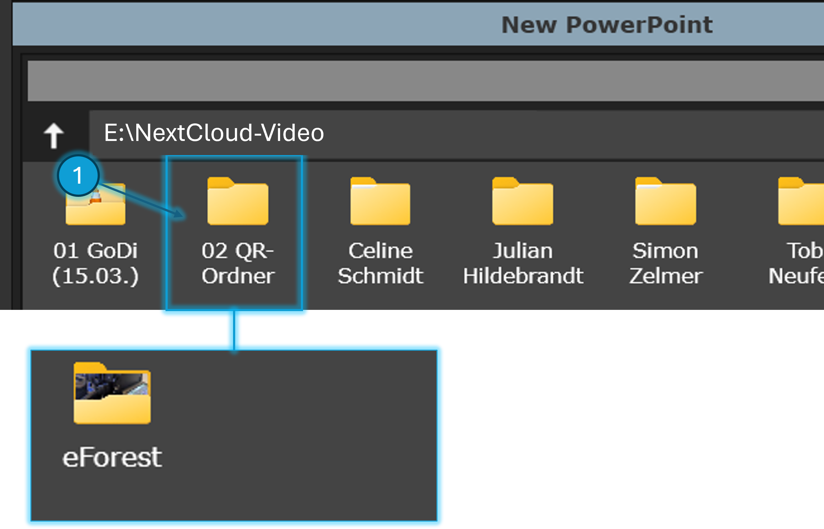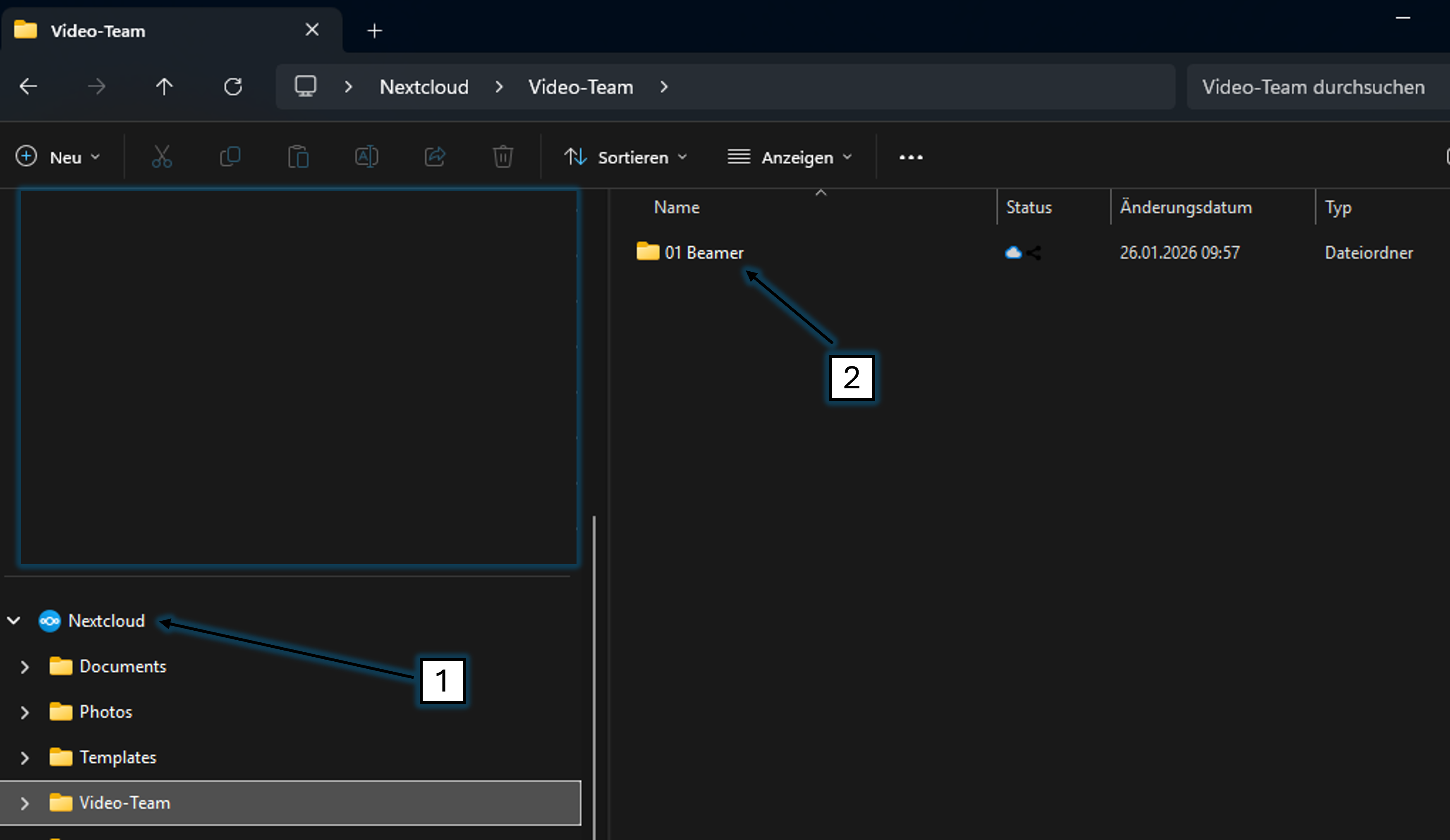 ✅ Nun solltest du im Datei-Explorer ’NextCloud’1️⃣ haben und den Ordner ’01 Beamer’2️⃣ sehen