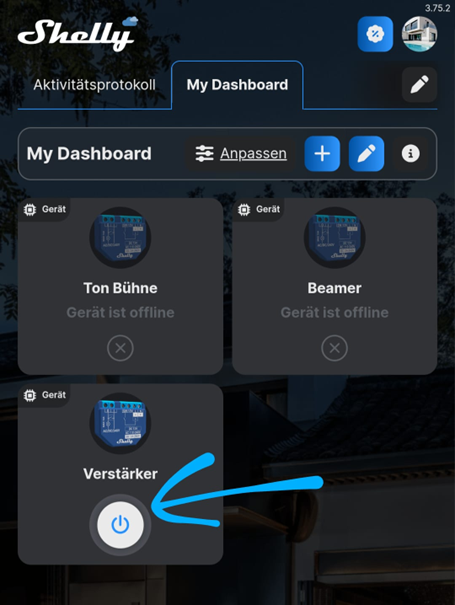 - Dann in Shelly ‘Verstärker’ aus und wieder anschalten